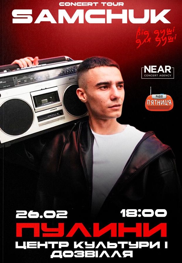Samchuk состоится 26 февраля 2026, 18:00, четверг в Центр культуры и досуга. С помощью сервиса internet-bilet.ua, Вы сможете с легкостью забронировать, заказать и купить билеты на интересующий Вас концерт, спектакль, оперу, балет, мастер-классы, спортивные и детские мероприятия, оплатив их самым удобным для Вас способом: через интернет банковской картой VISA/MasterCard, наличными или курьером, если сделаете заказ билета c доставкой.